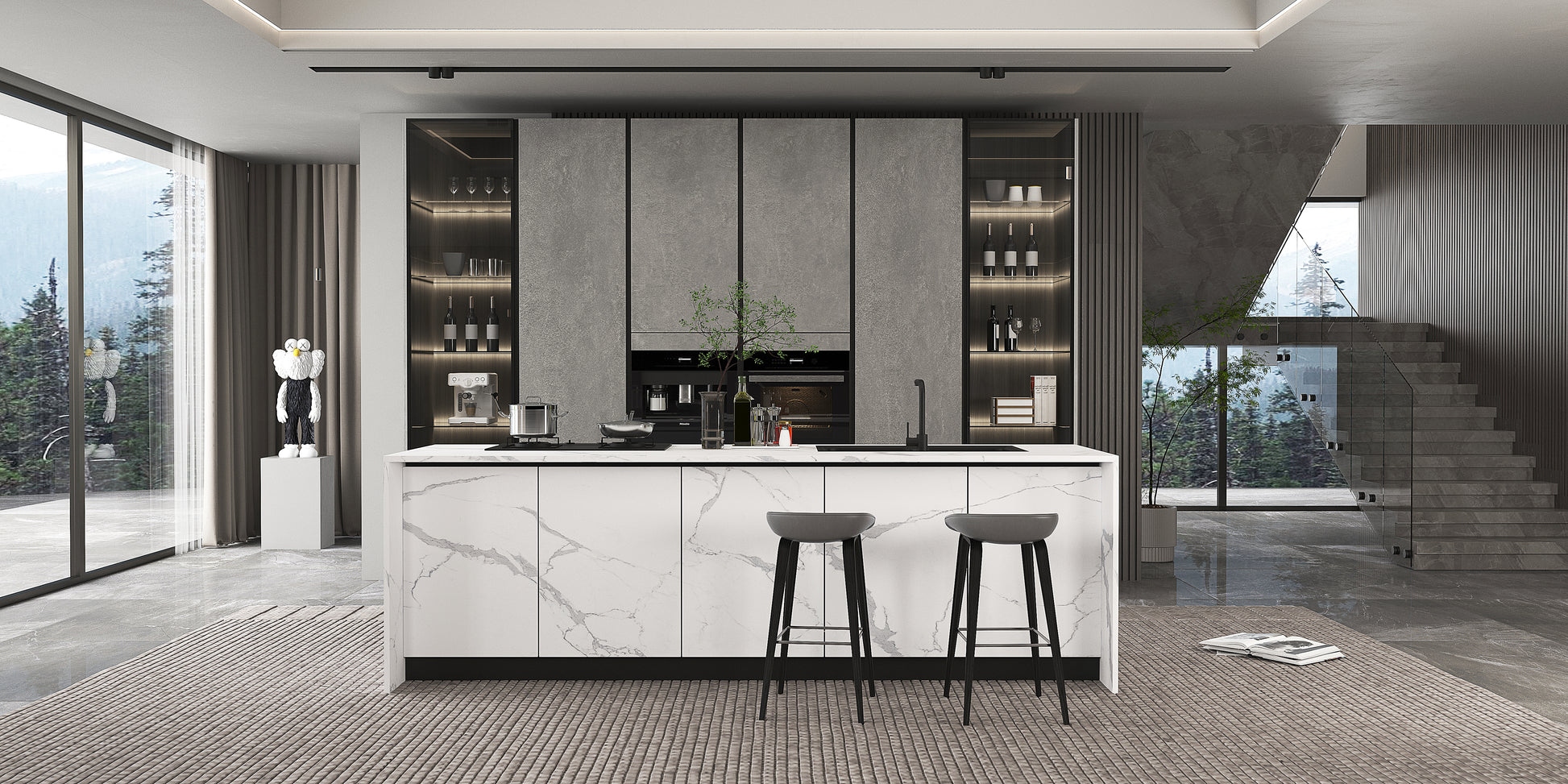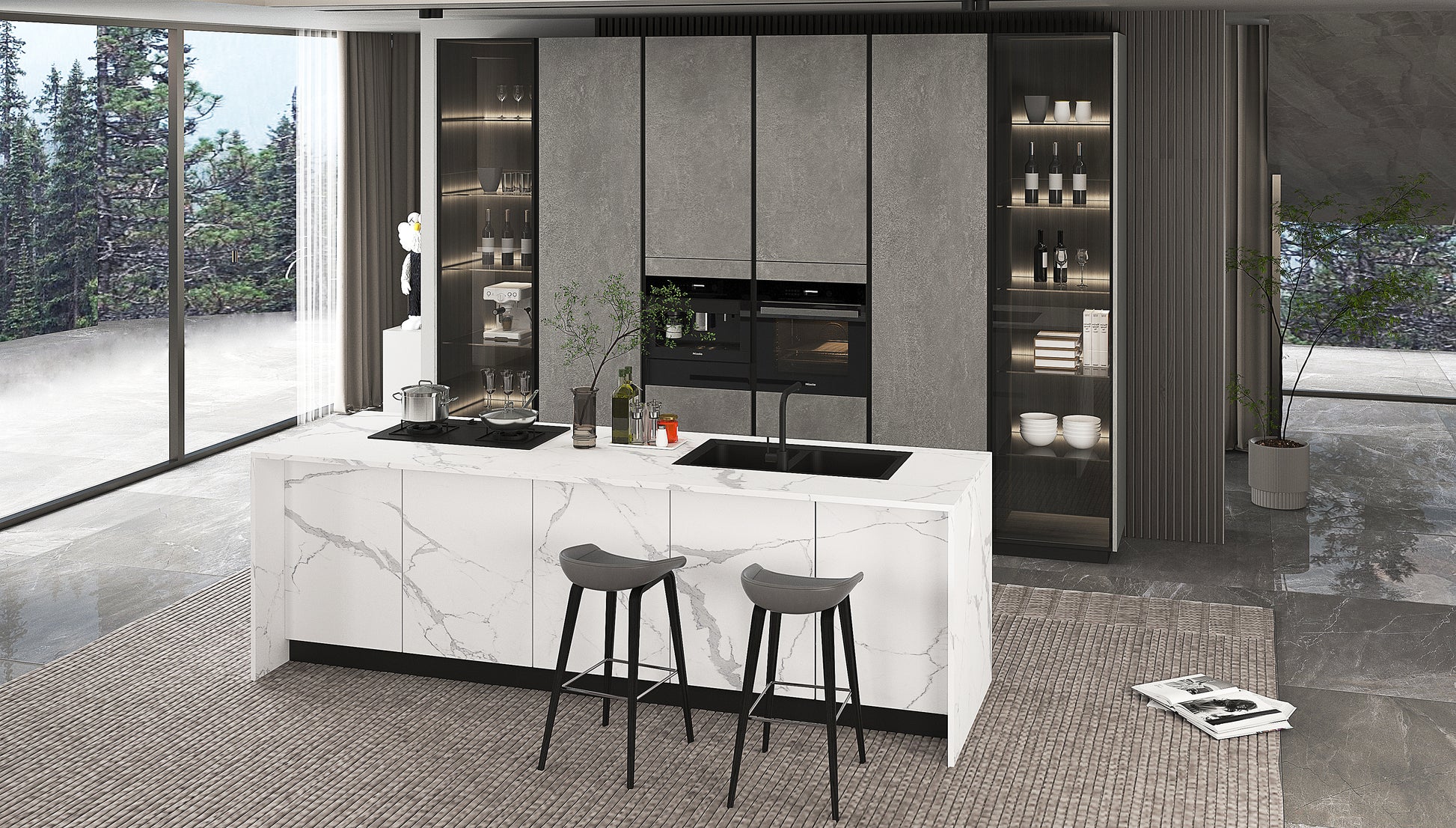 GoldenHome offers a variety of cabinet door panel options, including integrated panels, lacquer, thermofoil, and solid wood.